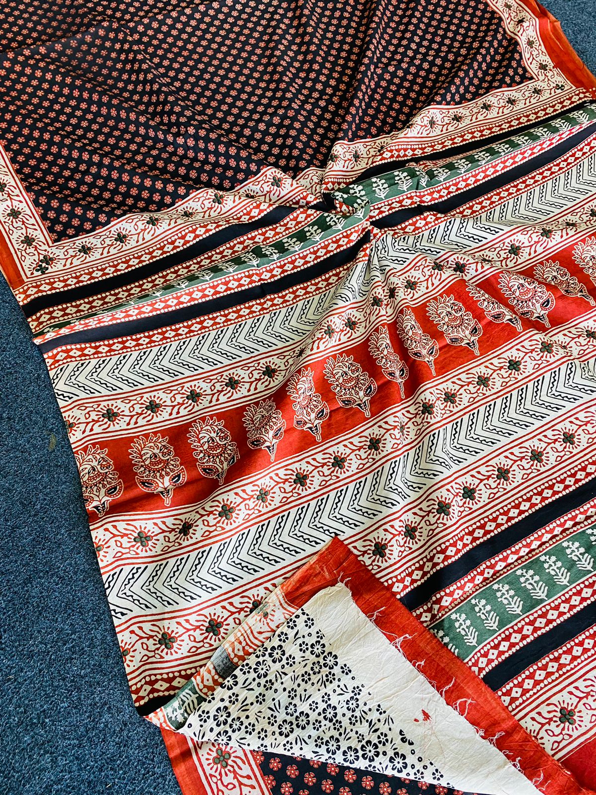 The deep black body is adorned with delicate small floral buta motifs, creating a subtle yet striking appeal. The contrasting pallu features horizontal bands in rust orange, green, ivory, and black, highlighted with traditional paisley and floral handblock-inspired patterns. The detailed geometric and zigzag borders frame the saree beautifully, adding depth and handcrafted charm to the overall design.