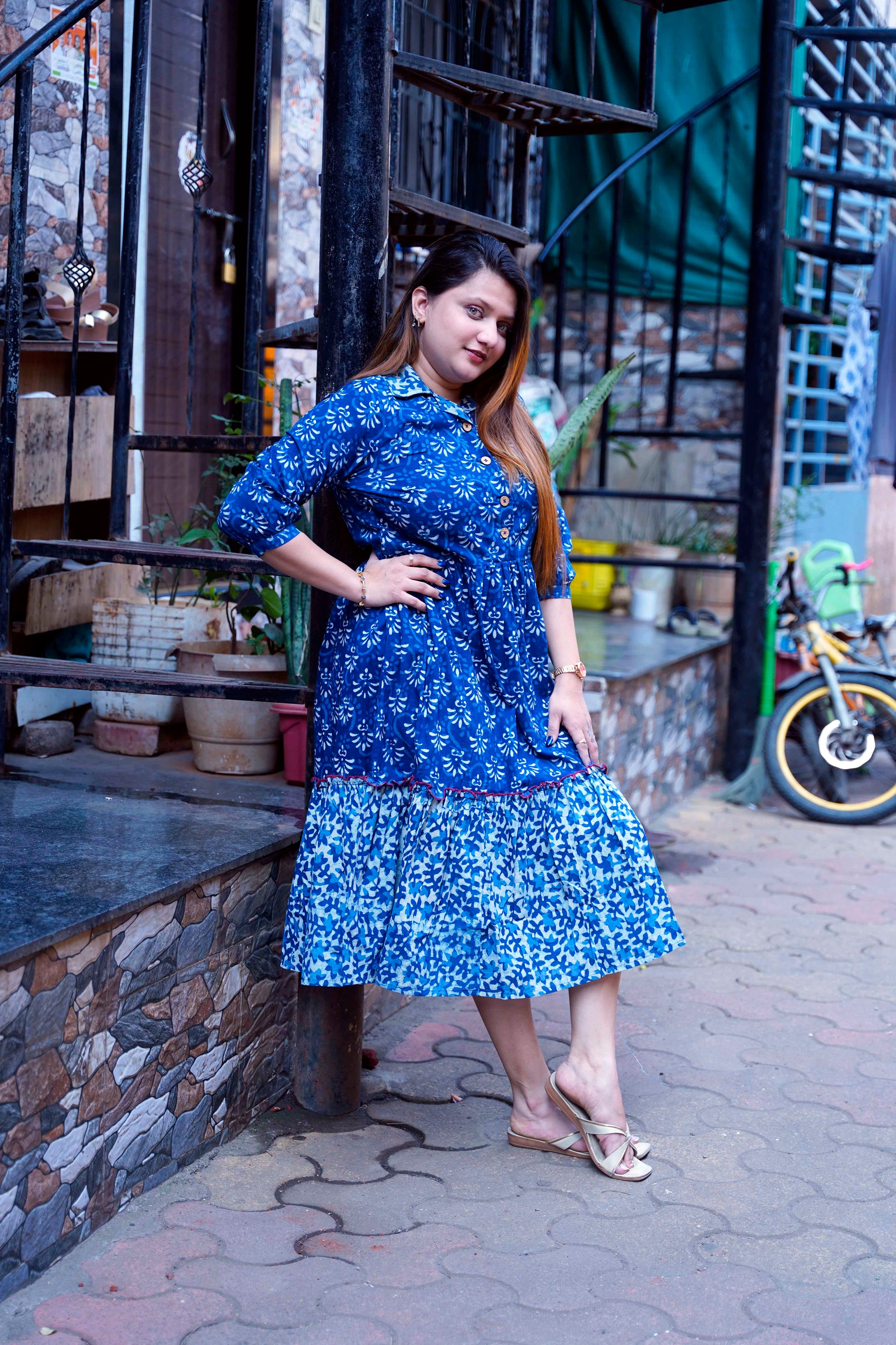 Indigo Dabu Print Open Collar Mid-Length Dress