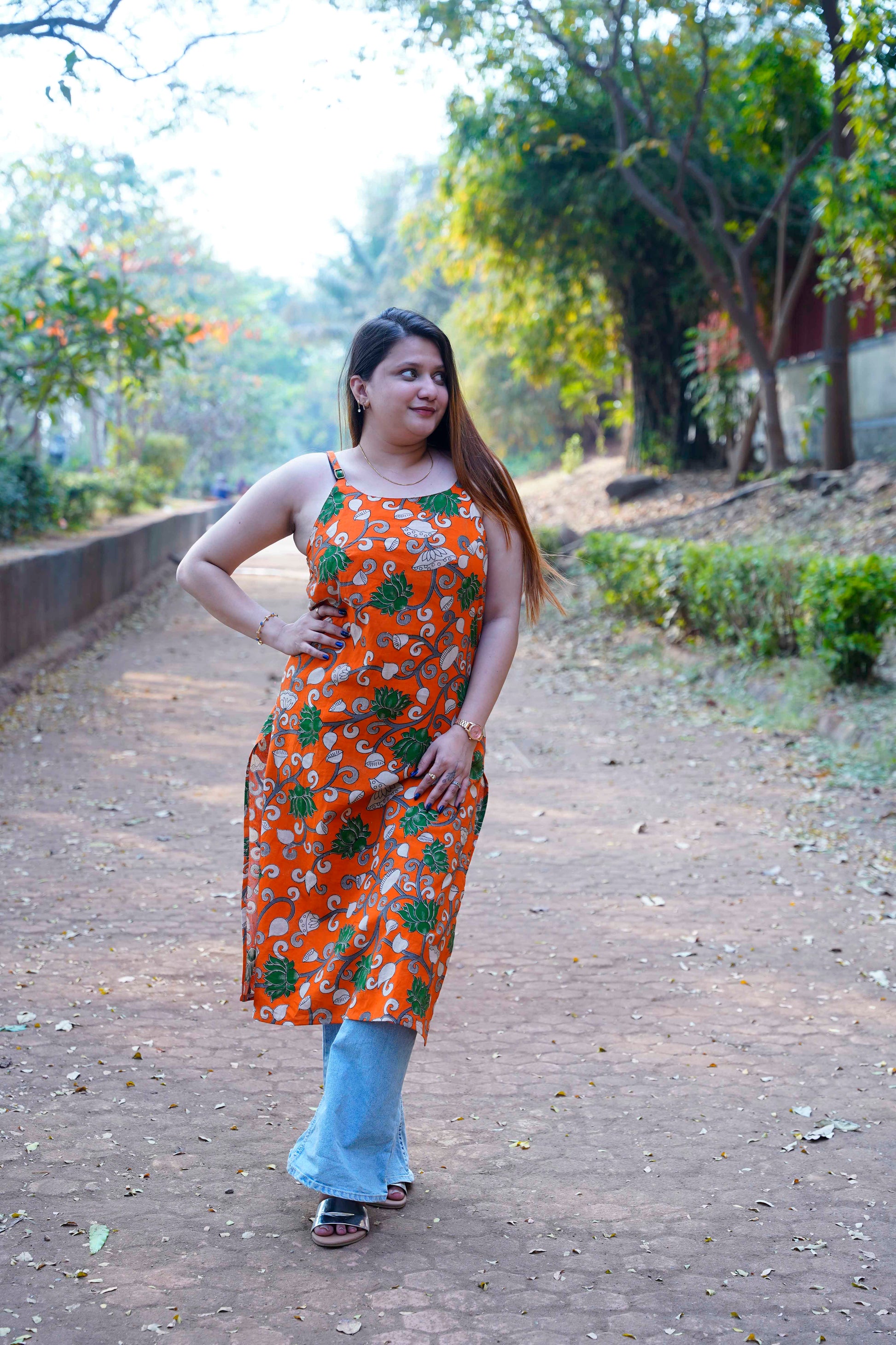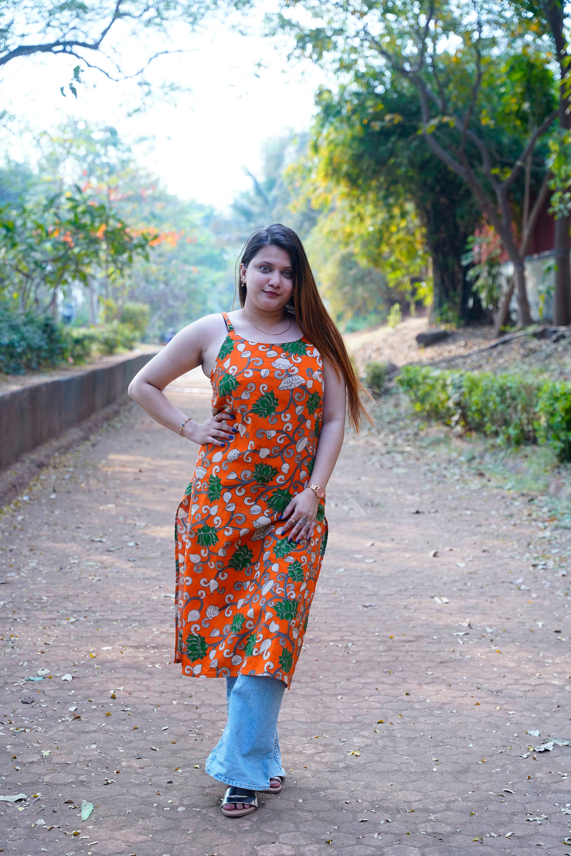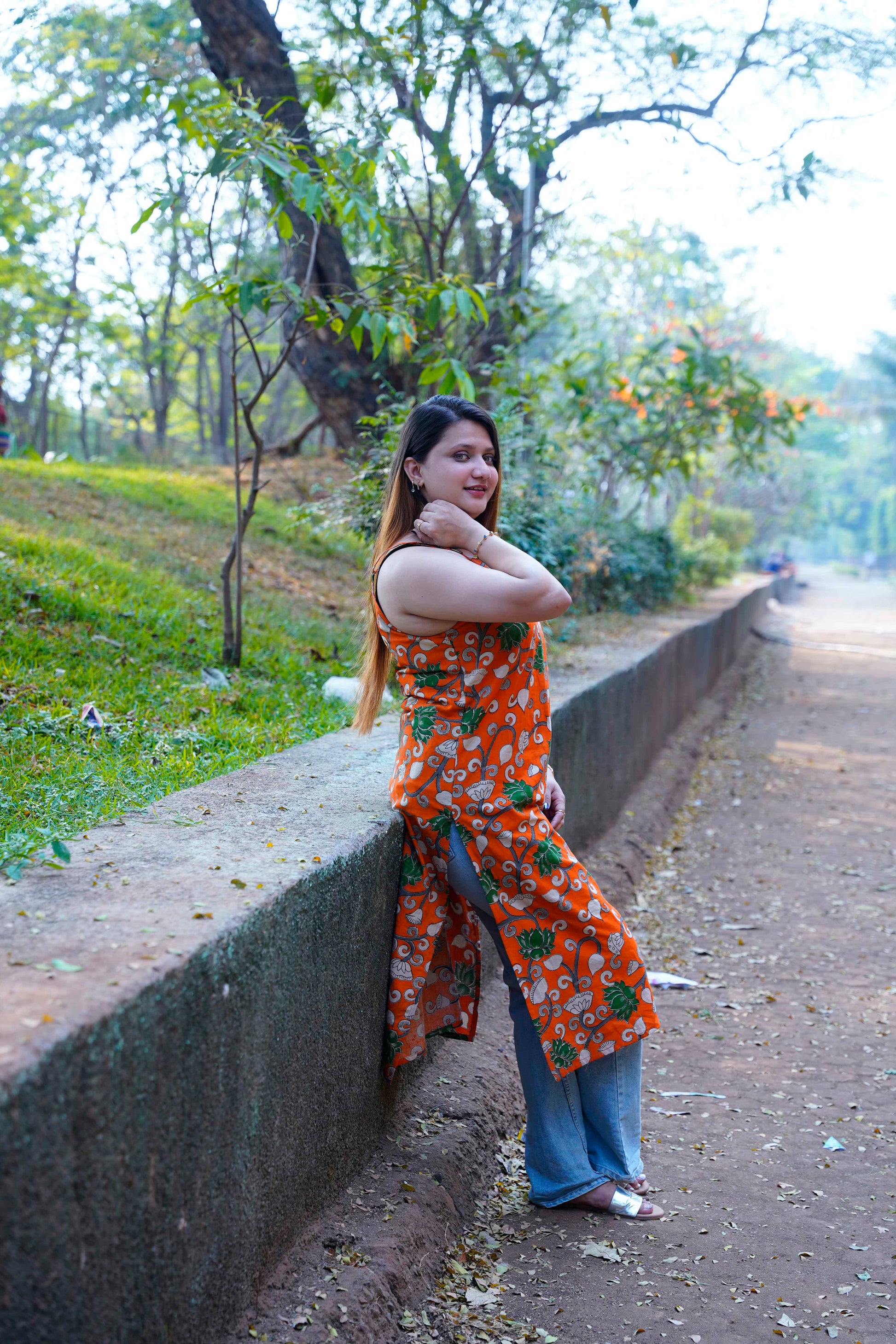 Turn heads with this vibrant orange handblock printed kurta, designed to bring freshness and charm to your everyday wardrobe.