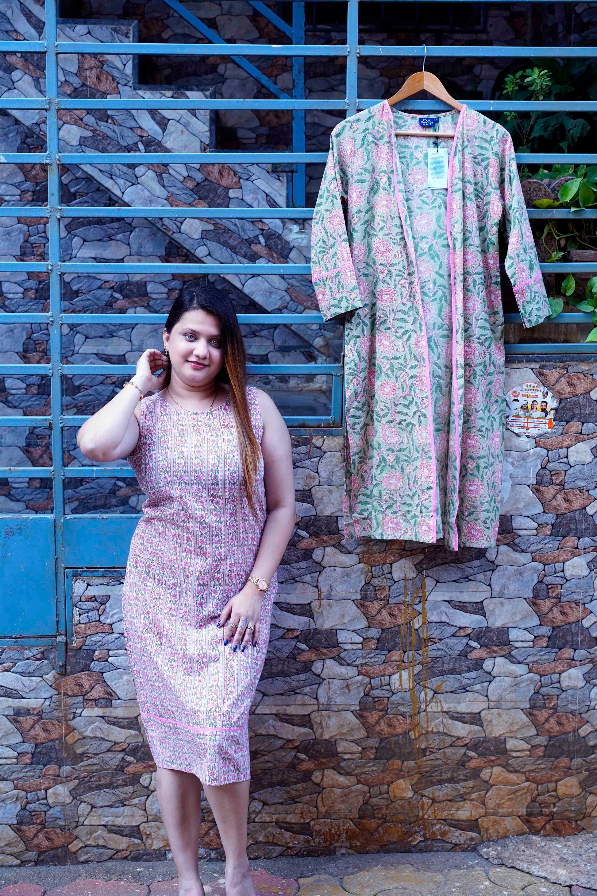 Embrace effortless elegance with this beautifully handcrafted floral kurta in soothing pink dabu print tones. Adorned with delicate pink floral motifs and intricate vertical panel detailing, this piece reflects the timeless beauty of traditional handblock printing.