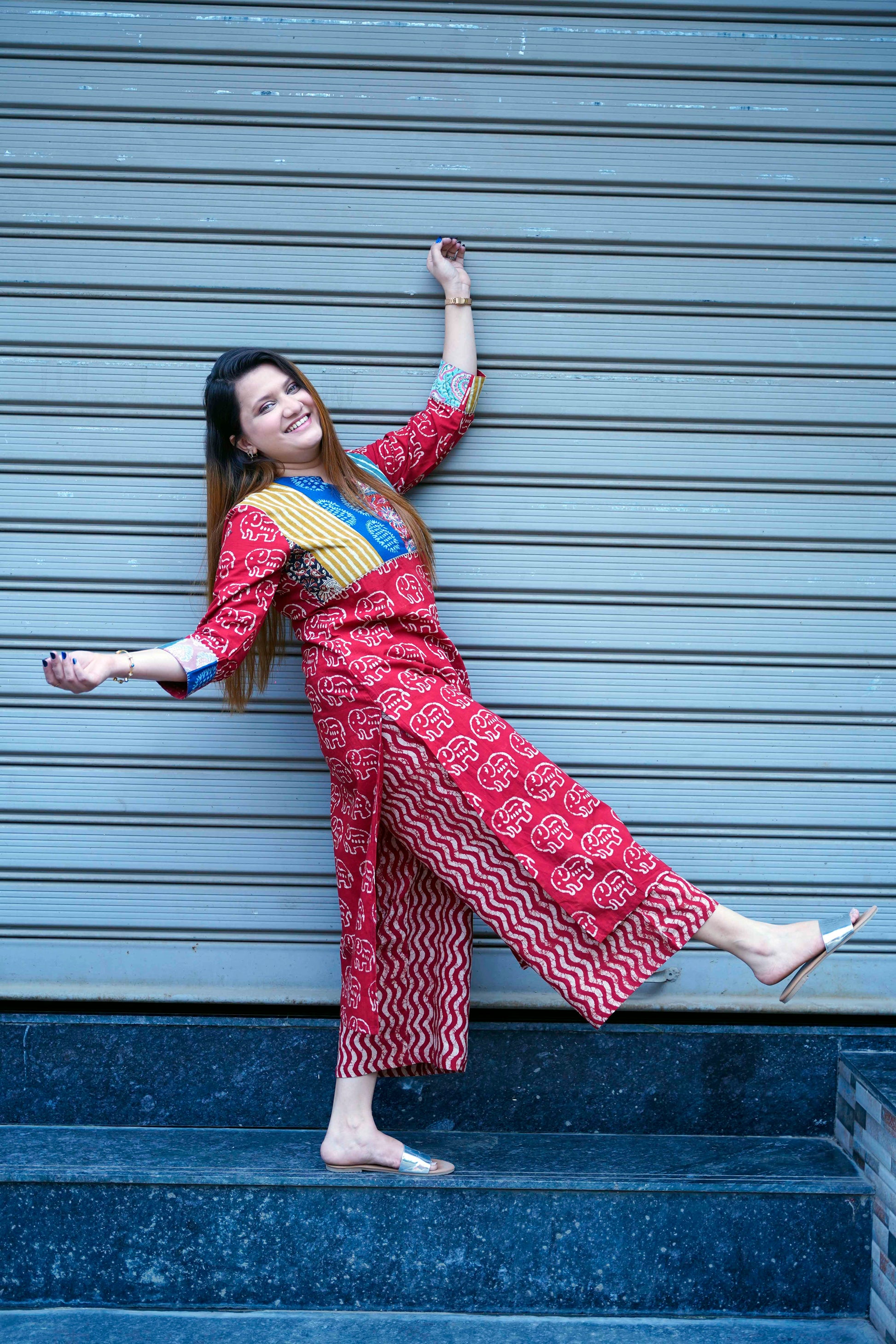 The rich red base adorned with intricate handblock motifs creates a bold yet elegant statement. Paired with coordinated wide-leg plazo pants, this set offers a flattering silhouette while ensuring all-day ease. Crafted in breathable cotton fabric, it is perfect for festive gatherings, office wear, casual outings, or special day occasions.