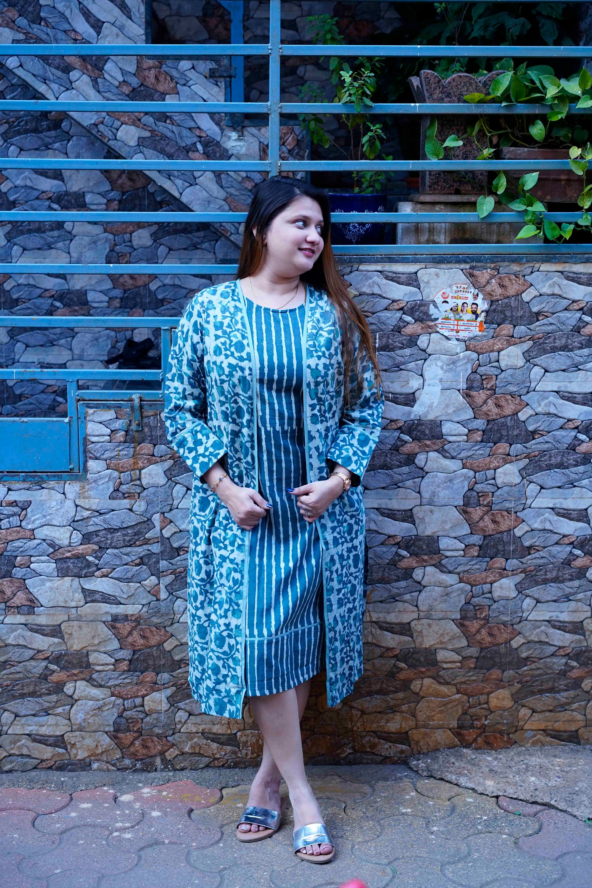 Elevate your everyday ethnic style with this elegant layered kurta set, crafted in beautiful handblock prints. Featuring a striped inner kurta paired with a coordinated printed overlay jacket, this ensemble blends traditional craftsmanship with contemporary layering.